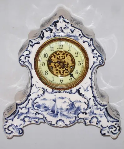 the nice blue and white Delft-style case is in good condition with worn rear labels, beveled glass. The porcelain dial has edge chip near 9. Movement ...