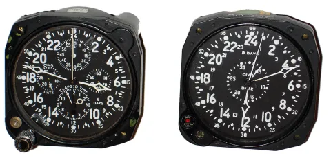 Two 3" black phenolic airplane clocks, Hamilton and Waltham.