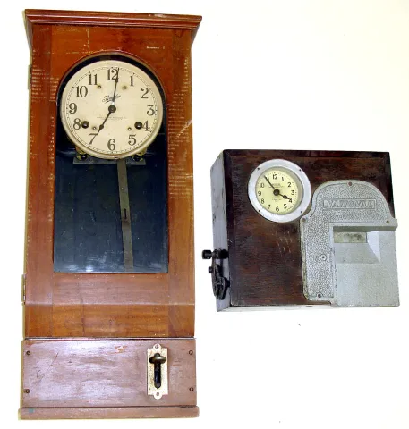 Two time recording 8 day clocks. First is Simplex, Gardner, Mass., U.S.A., 31" tall. Second is rarer, smaller (but also very heavy) English model, National Time Recorder Co., St. Mary Cray, Kent., 13" tall.