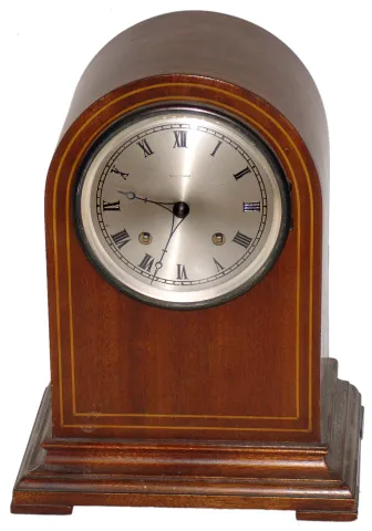 Waltham Clock Co. inlaid mahogany 8-day time and strike round top mantel clock, c1915