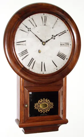 Atkins Clock Co., Bristol, Conn., wall clock 8 day time only spring driven movement in rosewood case with painted metal dial, c1865