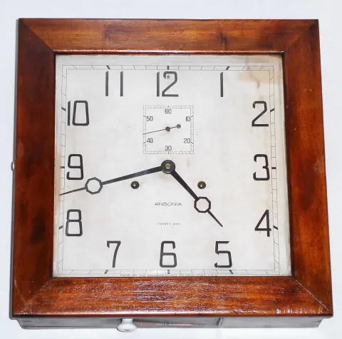 Ansonia Clock Co., "Depot" mahogany gallery clock with 30 day time only spring driven movement, c1926