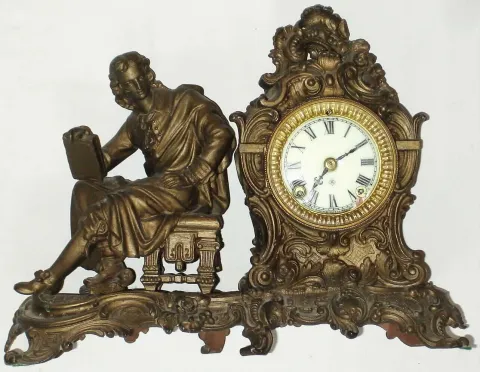 Ansonia Clock Co., New York, "Racine" figural mantel clock with 8 day time and strike spring driven movment in bronze finish cast metal case, c1901