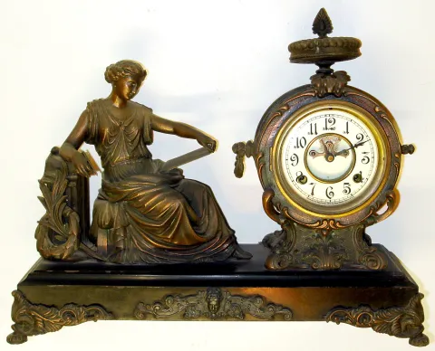 New Haven "Clotho" cast metal 8 day figural mantel clock, c1900.