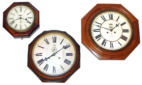 largest is oak time only Ansonia, 17" across, Middle is a oak Waterbury 12" Lever (partial rear label) time and strike, 15" across. Smallest is rare m...