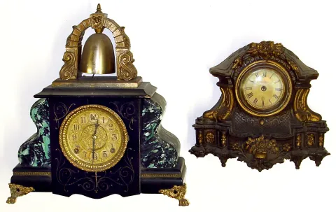 Two 8 day Connecticut mantel clocks. Smaller is scarce cast metal George B. Owen with wooden back and legible label. Gilbert "Curfew" retains bold marbleizing 17" tall.
