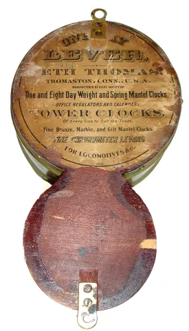 old polished finish on case, dial has scratches and tarnish. Near complete original rear paper label. Movement will need service. 11" high....