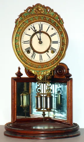 Rare clock, minus its glass dome and cupid, with original dial, mirrors, two barrel pendulum, gold/green bezel, rear decal label, etc. Some small dama...