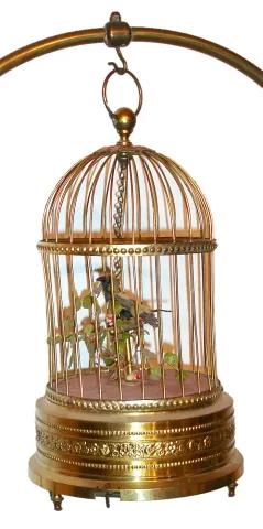 Single singing bird in cage manufactured by Karl Griesbaum, Triberg, Germany with mechanical movement imparting motion to bird on perch including brass stand for larger size bird cage, c1950