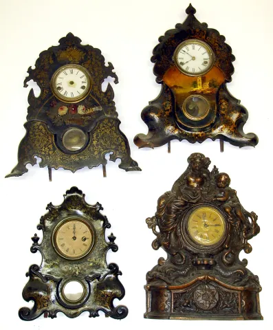 Four Connecticut iron front clocks. 2 with American Clock Co. inside labels, largest (with pin-pallet movement) is 17" high.