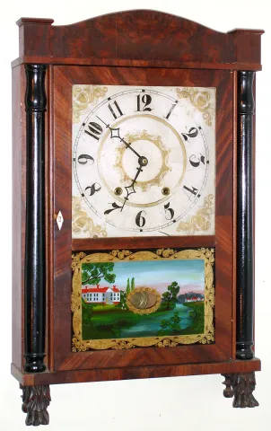 Eli Terry and Son, Plymouth, Conn., shelf clock with 30 hour wooden weight driven movement in half column and splat mahogany case, c1830