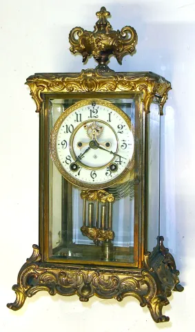 Original worn gold finish. Porcelain dial with one small hairline. Visible escapement with jewel pallets. Beveled glass all good with one tiny crack i...