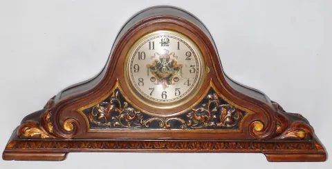 Chelsea Clock Co., Boston, Mass., painted ceramic 8 day house strike spring driven tambour mantel clock, c1919