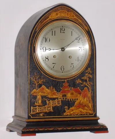 Waltham Clock Co., Waltham, Mass. Japanned 8 day time and strike spring driven mantel clock, c1925