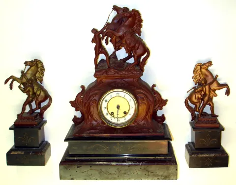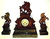 French marble equestrian figural garniture 8 day 3 piece clock set, c1890.