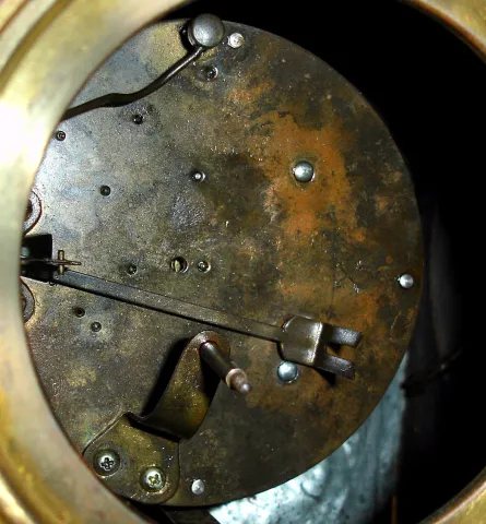 rearing cast metal horses, with red patina, on black and red marble case and side pieces. Porcelain and gold center dial, beveled glass. Bell strike r...