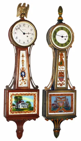 Two Waltham "Miniature Banjos" with 8 day time only spring driven key wind movements; one in green crackle case and the other in solid mahogany