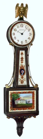 Waltham Clock Co., Waltham, Mass., "Miniature Banjo" 8 day time only stem wind spring driven movement with lever escapement in mahogany case with reverse painted tablets and painted metal dial, c1930
