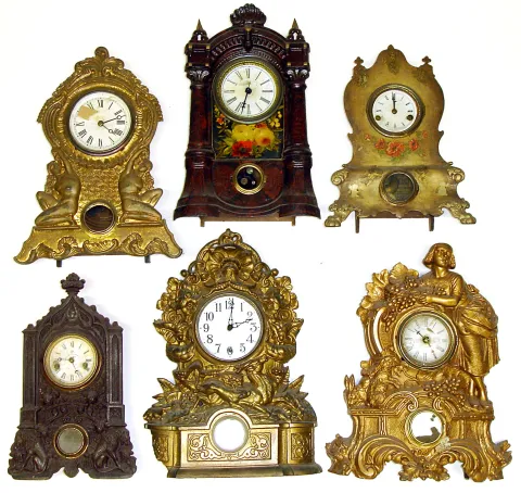 Six 8-day Connecticut iron fronts Large figural gold clock is N. Muller No. 67. One with bold floral and wood grain painting. Also examples by American Clock Co., U.S. Clock Co. dial with Terry and Edwards label, next to last in photo- Terhune and Edwards