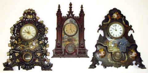 Three large Connecticut 8-day iron fronts Highly decorative. 2 with American Clock Co. inside labels, other has Bradley and Hubbard dial.
