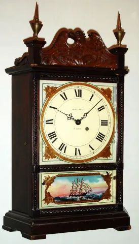 Waltham Watch Co., Waltham, Mass., miniature mantel clock 8 day spring driven movement with lever escapement in mahogany case with eagle splat and reverse painted tablet, c1930