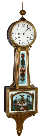 Waterbury Clock Co., Waterbury, Conn., "Willard No. 3" banjo wall clock 8 day time and strike spring driven movement in gold leafed front rope turned mahogany case with reverse painted throat and lower glass tablets and white enamel dial, c1910