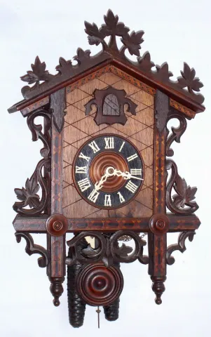 American Cuckoo Clock Co., Philadelphia, 30 hour two weight driven inlaid cuckoo clock, c1910