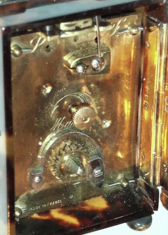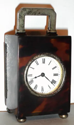 French, 8 day miniature carriage timepiece in a tortoise shell case with London 1912 hallmarked sterling silver handle, feet, latch and bezel, c1900