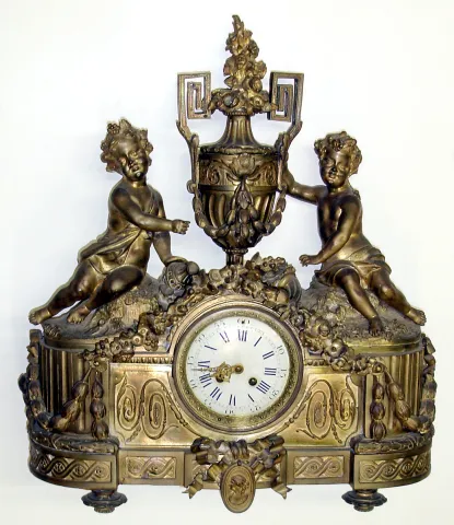 heavy, detailed and impressive case with cherubs, garlands, urn, etc. Round French movement with count wheel bell strike. Porcelain dial with blue num...