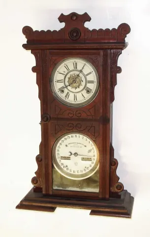Waterbury "Calendar No. 44" walnut 8 day time/strike/alarm shelf clock, c1891.