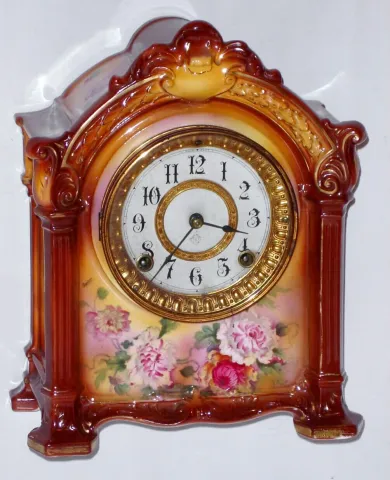Ansonia Clock Co., "La Savoie" Royal Bonn 8 day time and strike spring driven porcelain mantel clock, c1914