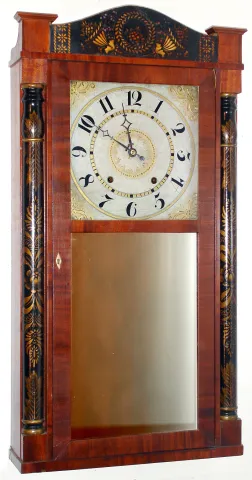refinished mahogany veneered case in nice condition with a couple of small veneer repairs. Stenciling on the columns has been restored. The splat look...