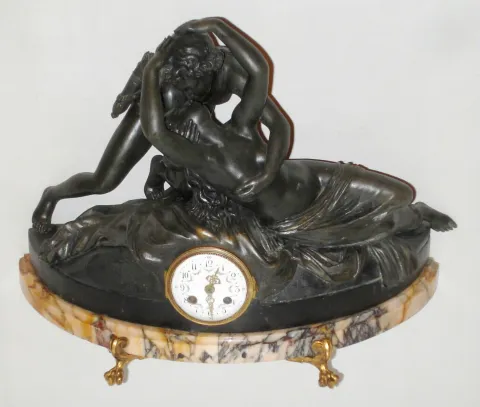 energetic young lovers await their eternal kiss. Intact case with old patina and nicely veined marble. 8 day bell strike movement with maker stamp, ne...