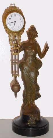 Junghans, Germany, "Diana", swinging arm novelty 8 day timepiece. The patinated spelter statue is affixed to a turned wooden base and a small well made movement is housed in the top of the 'clock arm'.