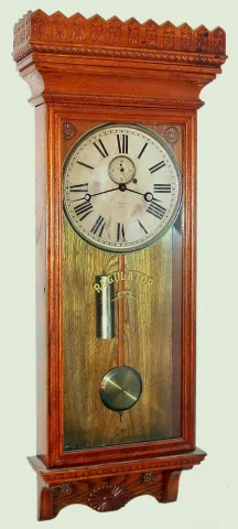 William Gilbert, Winsted, Conn. Regulator No. 14 oak 8 day weight driven wall clock, c1901.