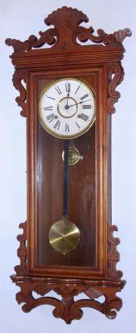 walnut case in very nice condition in original finish. Original paper dial is very nice for its age with a little wear. Pendulum and hands are origina...
