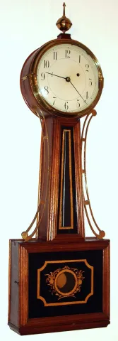 Cheney and Brinsmaid, Windsor, Vermont banjo wall clock 8 day time only weight driven movement in mahogany case with painted metal dial, c1825