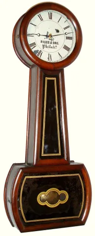 North Attleboro, Mass. "Banjo" wall clock attributable to George Hatch made for Riggs and Bro. Philadelphia 8 day time only weight driven movement in cherry case with reverse painted throat and lower tablets and painted metal dial, c1835