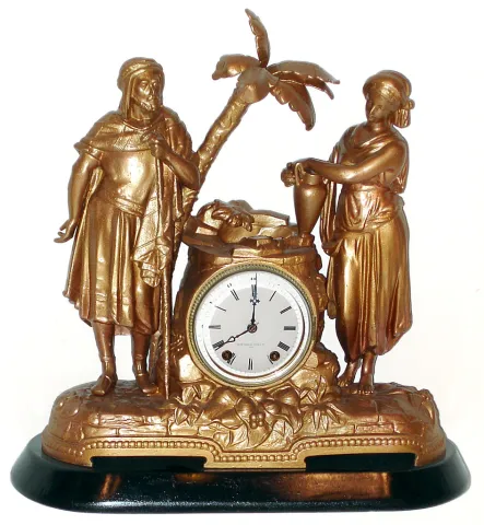 Seth Thomas and Sons No. 8003 double figure cast metal 15 day time and strike mantel clock, c1872.