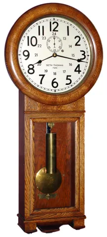 Seth Thomas Clock Co., Thomaston, Conn. "No. 2 Regulator" wall clock 8 day time only weight driven time only movement in oak case with painted dial, c1909
