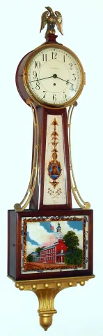 Waltham Clock Co., Waltham, Mass., full size banjo timepiece 8 day spring driven time only movement with lever escapement in mahogany case, c1930