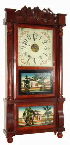 Elisha Manross, 8-day time/strike weight double decker with a carved splat shelf clock. c.1848.