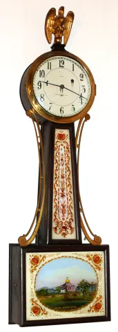 Chelsea Clock Company, Boston, banjo wall clock 8 day time only weight driven movement in plain front mahogany case with enameled metal dial, c1927