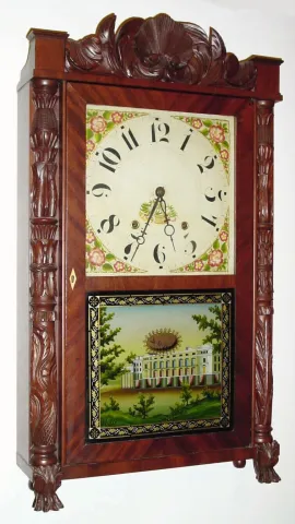Eli Terry and Son, Plymouth, Conn, short drop mahogany carved case, 2 weights, wooden works, c1832
