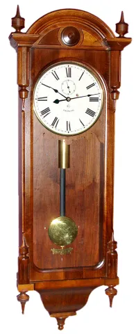 Seth Thomas Clock Co., Thomaston, Conn., "Regulator No. 6 Reissue" 8 day time only weight driven movement in walnut case with painted metal dial, c1975