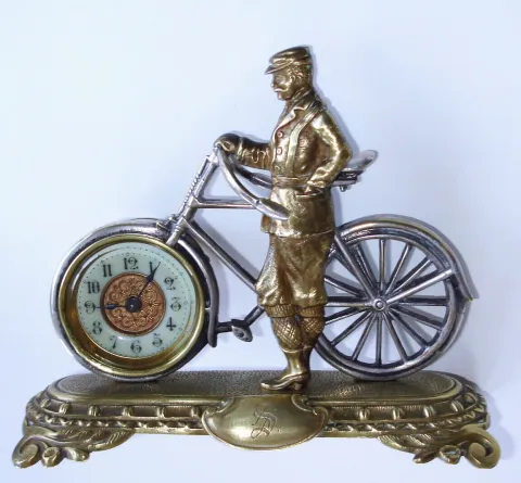 English, British United Clock Co, Ltd, Birmingham, a cast brass bicycle and male rider, in period riding clothes, and with a 30 hour rear wind and set movement in place of the front wheel, the whole on a shaped brass base with a cartouche bearing the init