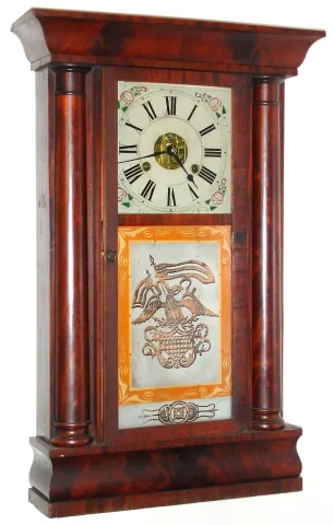 Birge and Fuller, Bristol, Conn., 8 day time/strike column and cornice shelf clock. c.1845