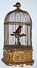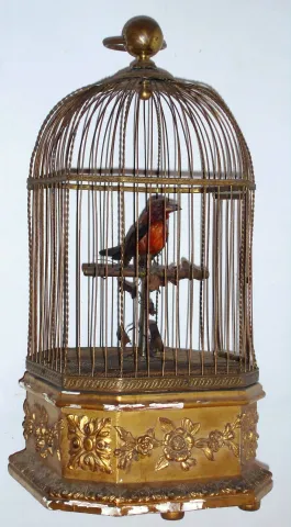 base of cage is missing one turned wooden foot. Gesso and gilding have failed along the base molding; cage is a bit loose. Is dusty. Plays and moves w...