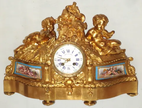 bright gilding and painted porcelain panels are all in very nice condition. Signed porcelain dial, with blue numbers, has a few repaired edge chips. G...