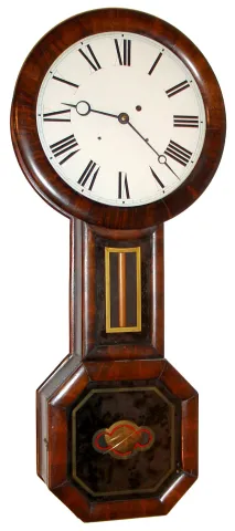 Williams and Hatch, North Attleboro, MA "Baltimore Banjo" wall clock 8 day time only weight driven movement in rosewood grain painted case with round top and octagonal bottom and painted zinc dial, c1860